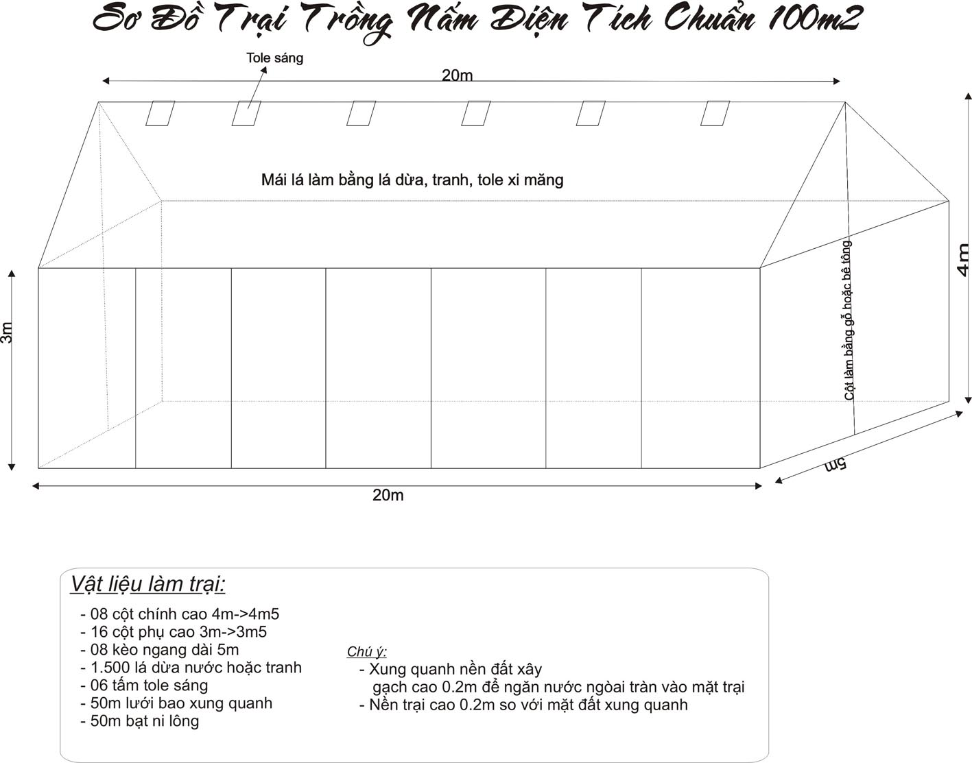 Trại lợp lá và nền đất mục đích để giữ độ ẩm và nhiệt độ cho trại. chiều cao từ nóc xướng nến đết là 4.2m, ta có thể sử dụng trại có lợp ngói xi măng hay tôn lạnh thì cần giữ độ ẩm cho trại.