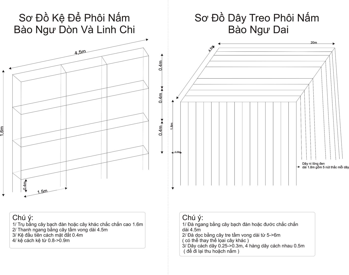 Kích thước trại 50m2 ->100m2 trở lên. Trong trại cần làm dây treo để treo bịch phôi ( theo kích thước dây của Cty đưa ra)