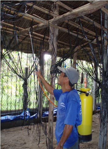 - Sau khi đã xây dựng xong mô hình trại, dùng 1 gói Actara cho 8lít nước, phun xịt lên toàn bộ trại (nền trại, kệ, dây treo…) 1 trại ta dùng 3 gói cho 100m2