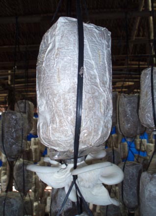 - Dây treo làm bằng nilon (có thể dùng dây khác), mỗi dây treo 5-6 bịch phôi tuỳ vào chiều cao người chăm sóc.
