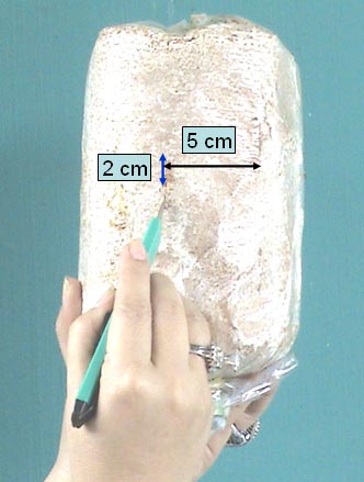 Đối với nấm treo: sau khi tưới tắm cho bịch phôi ta sẽ tiến hành rạch bịch: mỗi bịch chỉ rạch 7-9 đường, mỗi đường dài 2cm, đường này cách đường kia 5cm, mỗi đường sâu 3mm.
